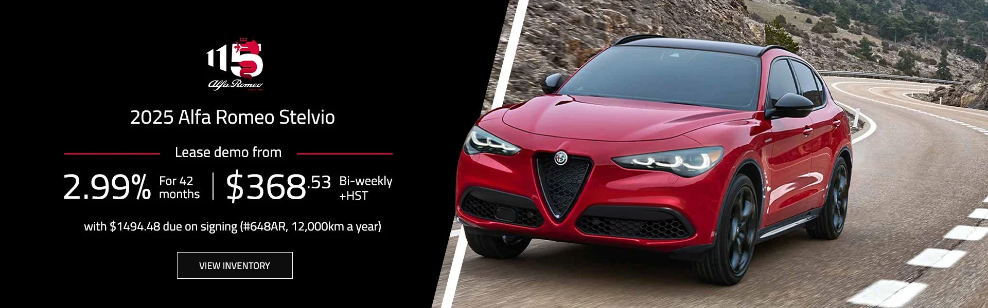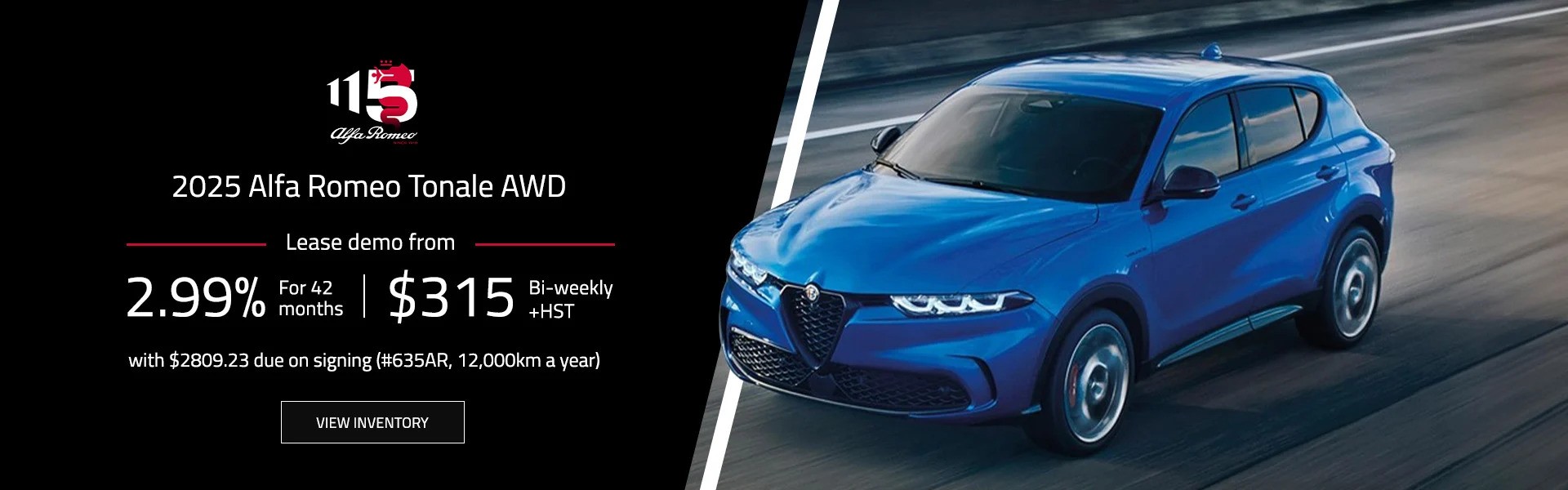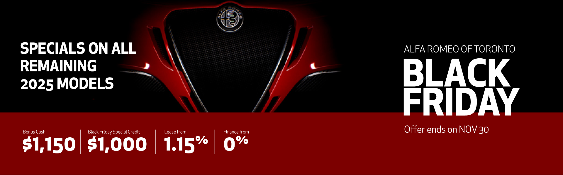 Disclaimer: Finance and Lease offers on approved credit. Regional offers, lease and finance conditions apply. See your local Alfa Romeo dealer for more information. Use of any calculation and/or tools on https://www.alfaromeooftoronto.ca does not constitute an offer of direct financing or any particular lease, finance, purchase option or transaction. Calculation and tools are intended for illustrative purposes only. Rates and requirements may vary depending on credit worthiness. Every effort is made to ensure the accuracy of the content on the pages on https://www.alfaromeooftoronto.ca. In the event of a discrepancy, error or omission, vehicle prices, offers and features as established by Alfa Romeo Canada and participating Alfa Romeo dealers in Canada, will prevail.